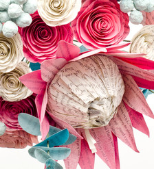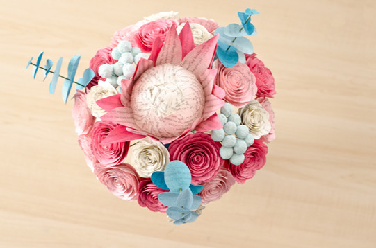 Welcome to a magical fusion of literary romance and tropical elegance. These Harry Potter bouquets feature bold king protea and roses artfully crafted from pages of the beloved series. Vibrant shades of pink, mint, and teal brought the arrangement to life, while coordinating sheet music boutonnieres added a musical touch.